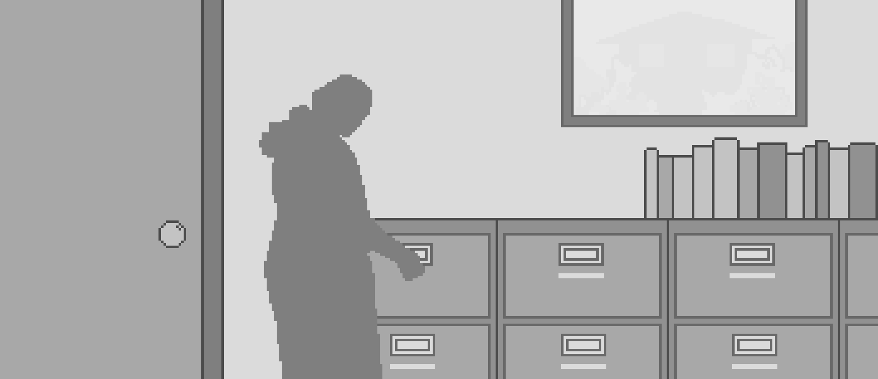 Inside the small office, an older woman is ruffling through a filing cabinet. She hears you and turns.
