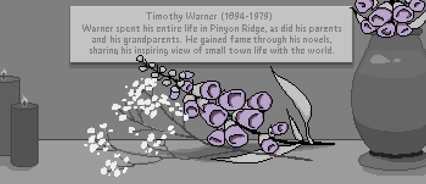 The plaque reads: Timothy Warner (1894-1979) Warner spent his entire life in Pinyon Ridge, as did his parents and his grandparents. He gained fame through his novels, sharing his inspiring view of small town life with the world.
